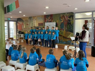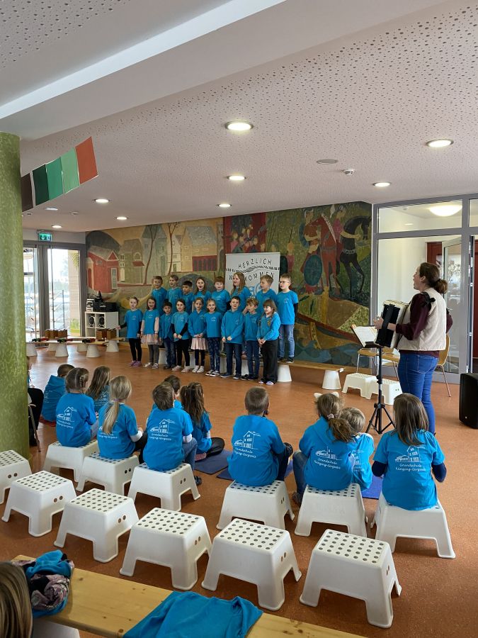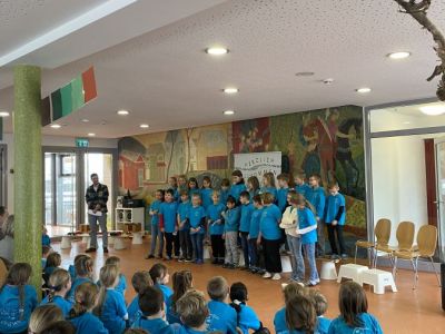 Am 8. Januar feierte der Künzinger Bürgermeister Siegfried Lobmeier seinen 60. Geburtstag. Anlass für die Musikalische Grundschule ihm in einer kleinen Feier zu gratulieren. Zusammen mit Gattin Anita kam Hr. Lobmeier zu uns in die Aula, wo ihn schon alle Kinder erwarteten. Im Vorfeld hatten sie zusammen mit ihren Lehrerinnen und Lehrern Lieder, Gedichte und andere Beiträge vorbereitet. Nach einer Begrüßungsrede durch Ulrike Eckl genoss Lobmeier die vielfältigen Darbietungen der Schülerinnen und Schüler sichtlich. Gerührt bedankte er sich im Anschluss bei der gesamten Schulfamilie für die Feier, aber auch für die gute Zusammenarbeit im Schulverband und die Arbeit der Lehrerinnen und Lehrer an "seiner" Schule. Eine besondere Einladung erhielt der Bürgermeister von Anita Maier aus der OGTS: An einem Tag darf er zum Mittagessen in die OGTS kommen und dort auch den Apfelsaft genießen, der von den Künzinger Streuobstwiesen stammt, wo auch Lobmeier regelmäßig mithilft.