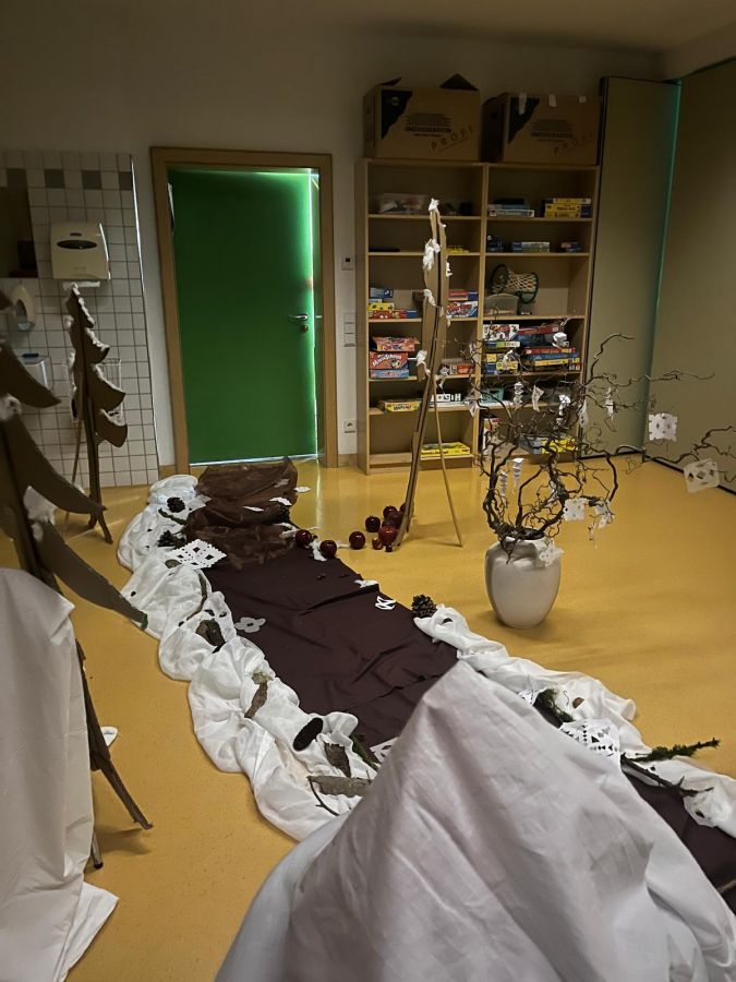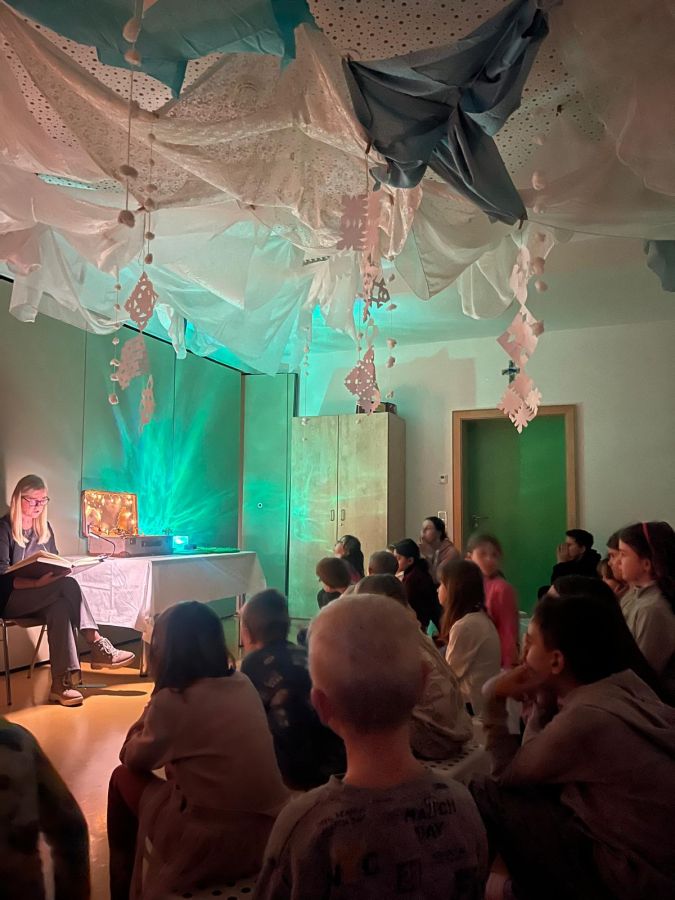 Der zweite Projekttag in der Ogts fand am 27.1. statt. Die Kinder durchschritten diesmal den Winterwald, begleitet von Schneeflockenmusik und Holzduft. Sie stiegen durch den Märchenreifen ins magische Zimmer, das mit hellblau-weißen Tüchern, Zufallssternen und Schneeflocken abgehängt war. Fr. Kröninger erzählte das Märchen von " Frau Holle". Im Anschluss gestalteten die Kinder Glitzer-Schneegläser und hörten ein Lied zum Märchen, dessen Reimtext sie schnell mitsangen.