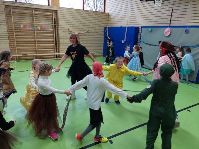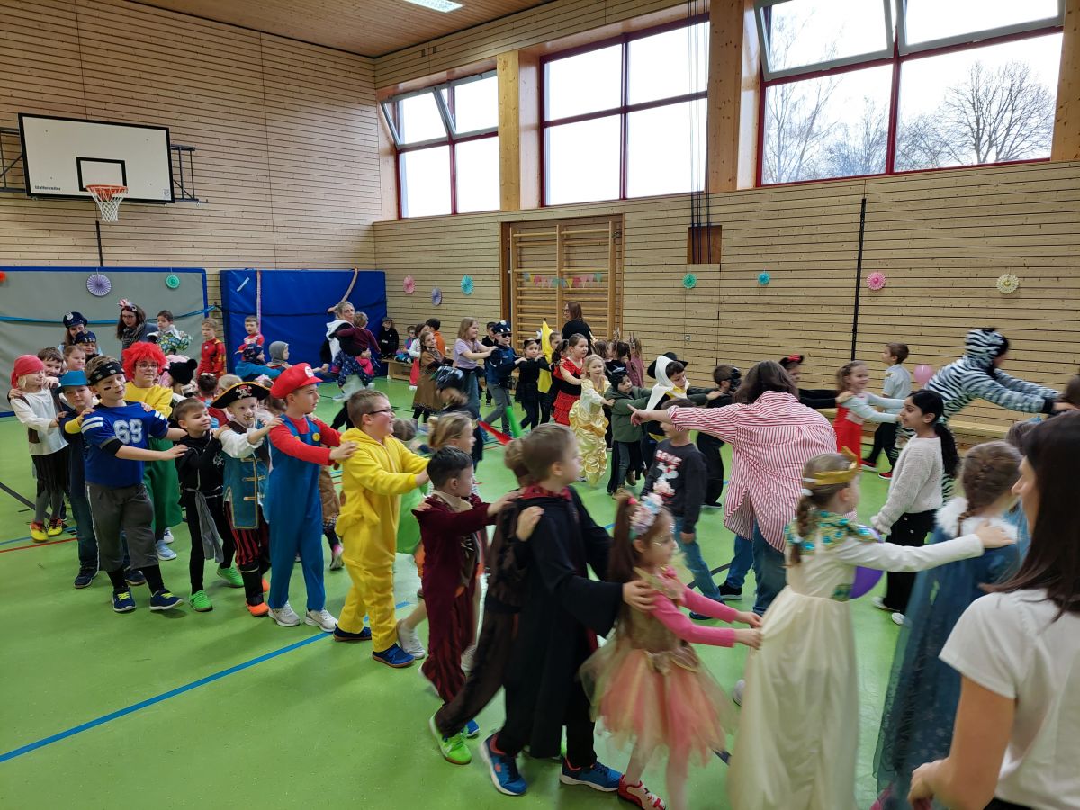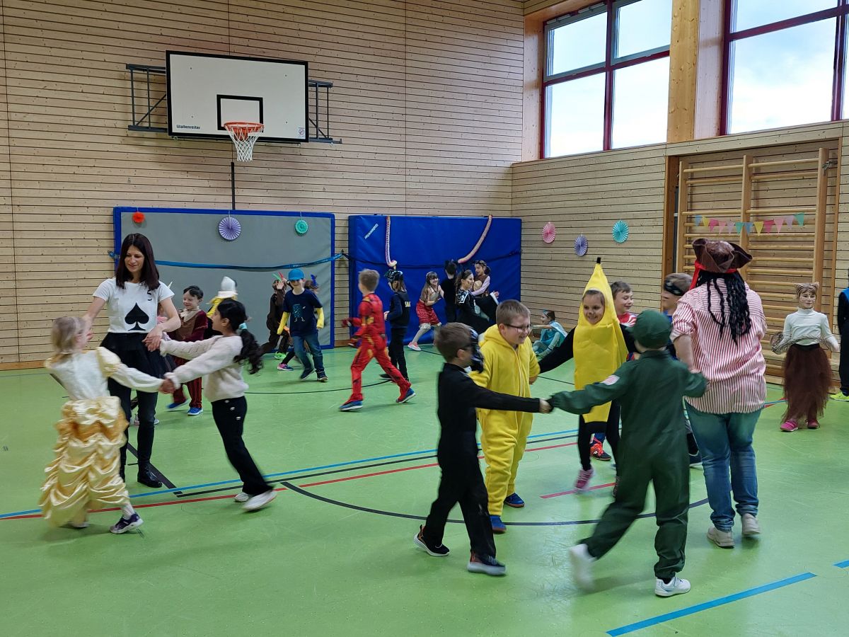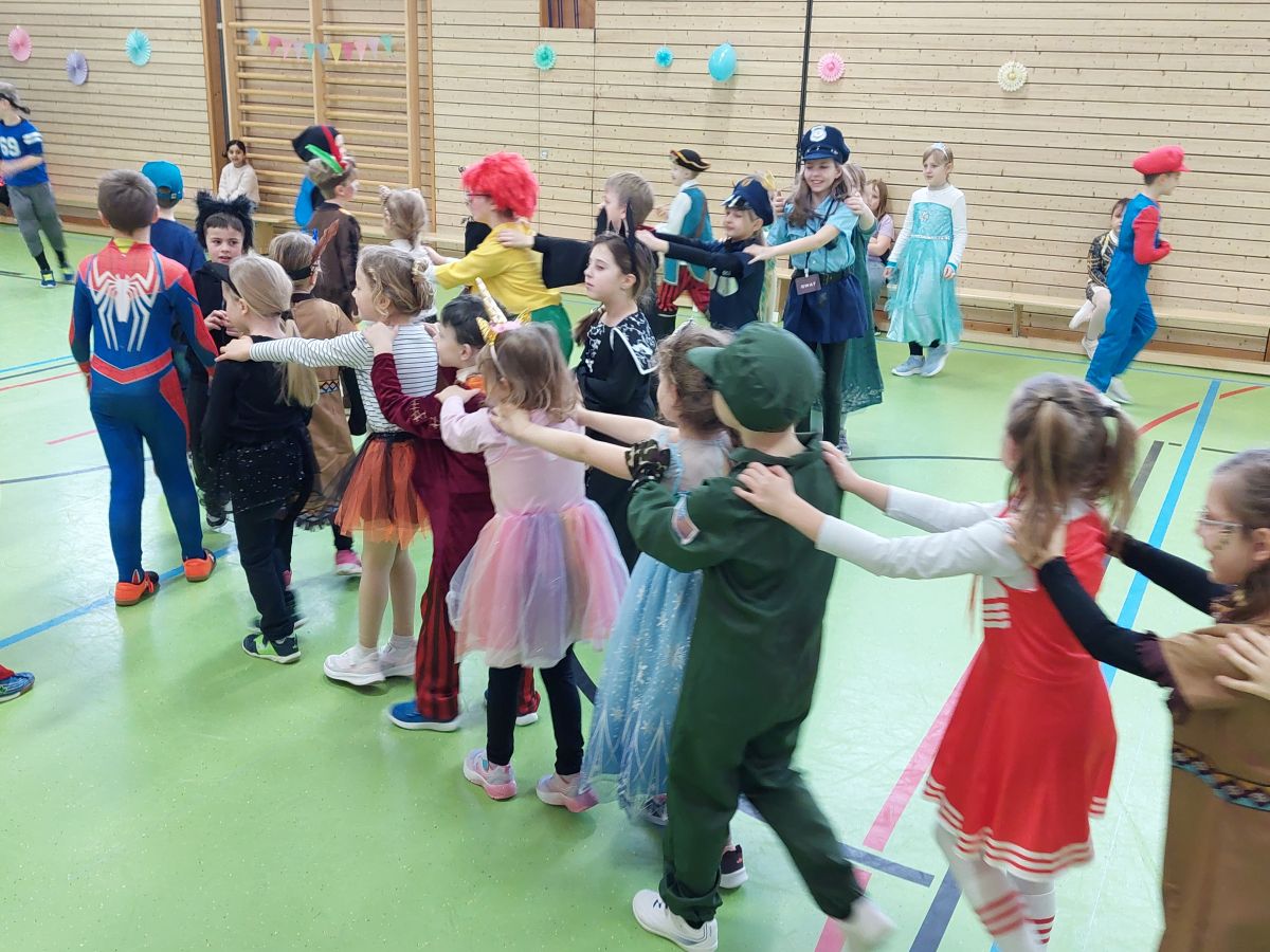 Bei der traditionellen Faschingsgaudi in der Turnhalle staunten unsere Schülerinnen und Schüler am Freitag, den 13.02.26, über viele kreative Verkleidungen und feierten zwei Schulstunden lang ausgelassen. Die Kinder sangen und tanzten fröhlich zu beliebten Liedern und zeigten Geschicklichkeit beim Eierlauf und weiteren Spielen. Für gute Stimmung bei der ersten und zweiten Jahrgangsstufe sorgte auch der Besuch des Künzinger „Gaudiwurms“ mit den Kindergartenkindern. Die Polonaise mit Groß und Klein war für alle ein schönes Gefühl des Miteinanders. Zudem kümmerten sich der Elternbeirat und das Schlemmerpause- Team mit einem gesunden Faschingsbuffet um die nötige Stärkung. Mit viel Liebe zubereitet gab es in der Aula frisches Obst, Gemüse und kleine Köstlichkeiten. Ein herzliches Dankeschön an alle Helferinnen und Helfer sowie Mitfeiernde.