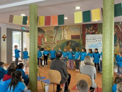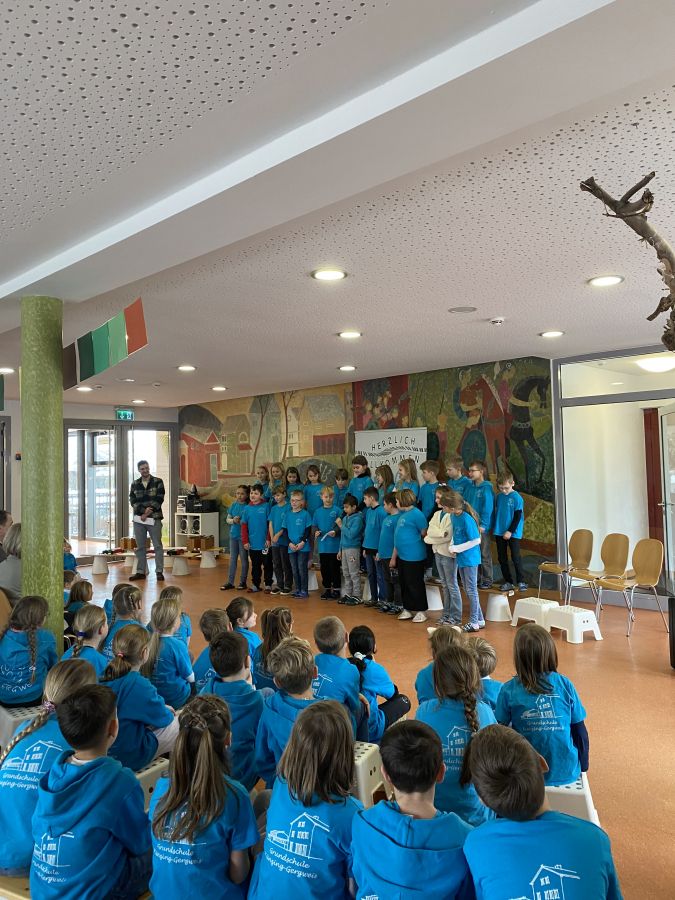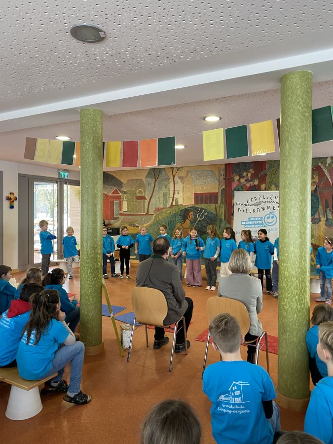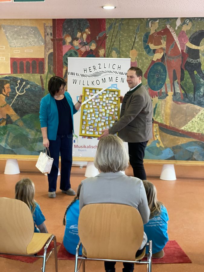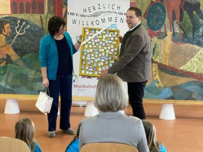 Am 8. Januar feierte der Künzinger Bürgermeister Siegfried Lobmeier seinen 60. Geburtstag. Anlass für die Musikalische Grundschule ihm in einer kleinen Feier zu gratulieren. Zusammen mit Gattin Anita kam Hr. Lobmeier zu uns in die Aula, wo ihn schon alle Kinder erwarteten. Im Vorfeld hatten sie zusammen mit ihren Lehrerinnen und Lehrern Lieder, Gedichte und andere Beiträge vorbereitet. Nach einer Begrüßungsrede durch Ulrike Eckl genoss Lobmeier die vielfältigen Darbietungen der Schülerinnen und Schüler sichtlich. Gerührt bedankte er sich im Anschluss bei der gesamten Schulfamilie für die Feier, aber auch für die gute Zusammenarbeit im Schulverband und die Arbeit der Lehrerinnen und Lehrer an "seiner" Schule. Eine besondere Einladung erhielt der Bürgermeister von Anita Maier aus der OGTS: An einem Tag darf er zum Mittagessen in die OGTS kommen und dort auch den Apfelsaft genießen, der von den Künzinger Streuobstwiesen stammt, wo auch Lobmeier regelmäßig mithilft.