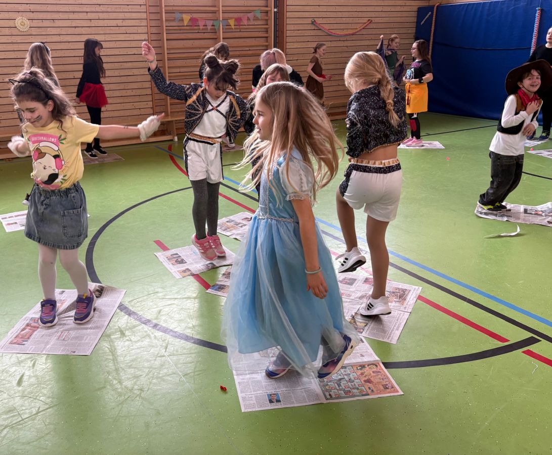 Am letzten Schultag vor den Ferien ging es für die 3. und 4. Klasse bestens gestärkt nach der gesunden Pause in die Turnhalle zur Faschingsgaudi. Fantasievoll verkleidet als Schmetterlinge, Eisprinzessinnen, Cowboys, Polizisten, Fußballstars, Cheerleader und vielem mehr wurde ausgelassen zu Partymusik Fasching gefeiert. Spiele wie Stopptanz, Zeitungs- und Luftballontanz durften dabei natürlich nicht fehlen.