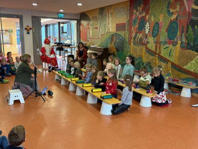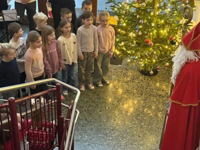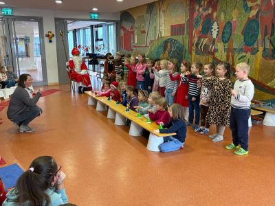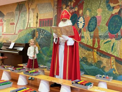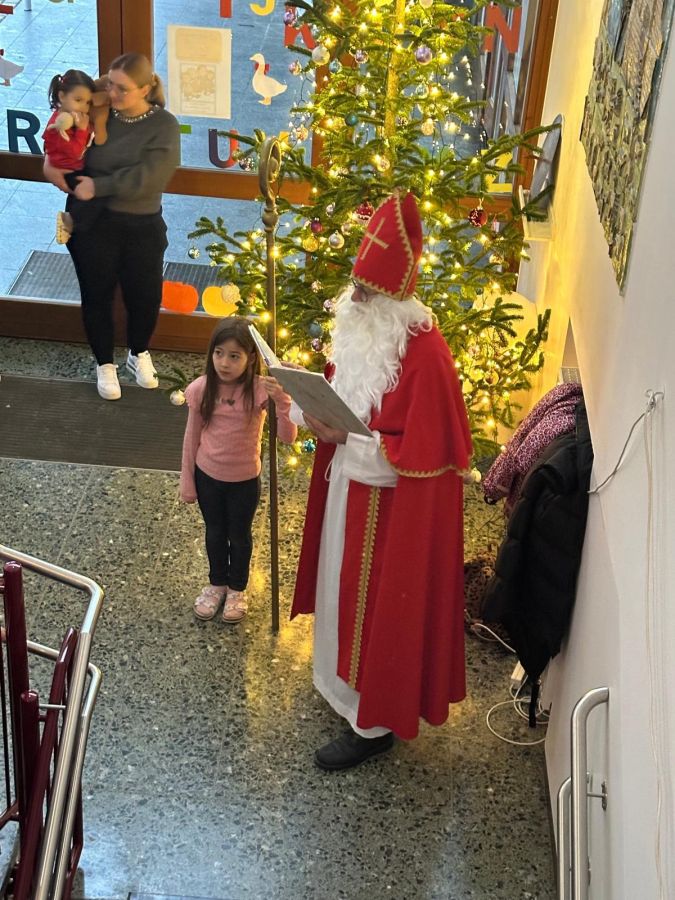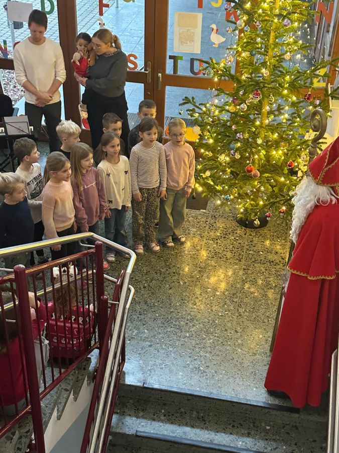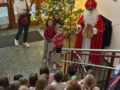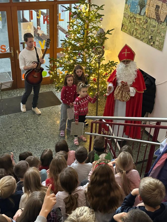 Am Freitag besuchte der Nikolaus gleich beide Schulhäuser. Natürlich wurde er musikalisch begrüßt. Darüber freute er sich sehr und schenkte den Klassen kleine Geschenke.