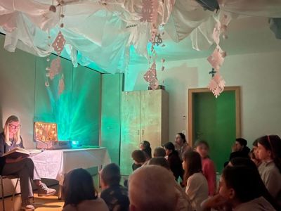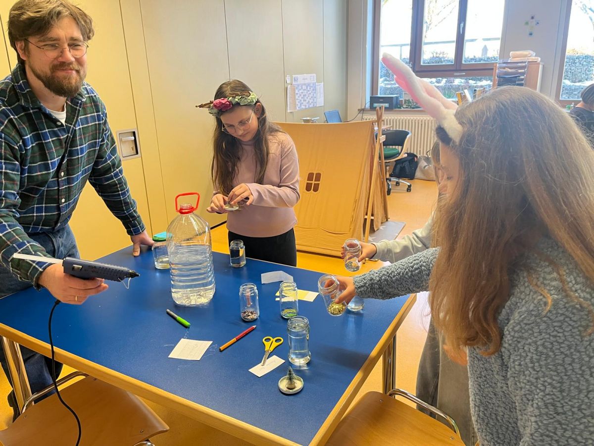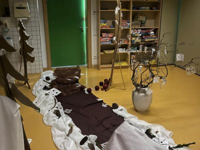 Der zweite Projekttag in der Ogts fand am 27.1. statt. Die Kinder durchschritten diesmal den Winterwald, begleitet von Schneeflockenmusik und Holzduft. Sie stiegen durch den Märchenreifen ins magische Zimmer, das mit hellblau-weißen Tüchern, Zufallssternen und Schneeflocken abgehängt war. Fr. Kröninger erzählte das Märchen von " Frau Holle". Im Anschluss gestalteten die Kinder Glitzer-Schneegläser und hörten ein Lied zum Märchen, dessen Reimtext sie schnell mitsangen.